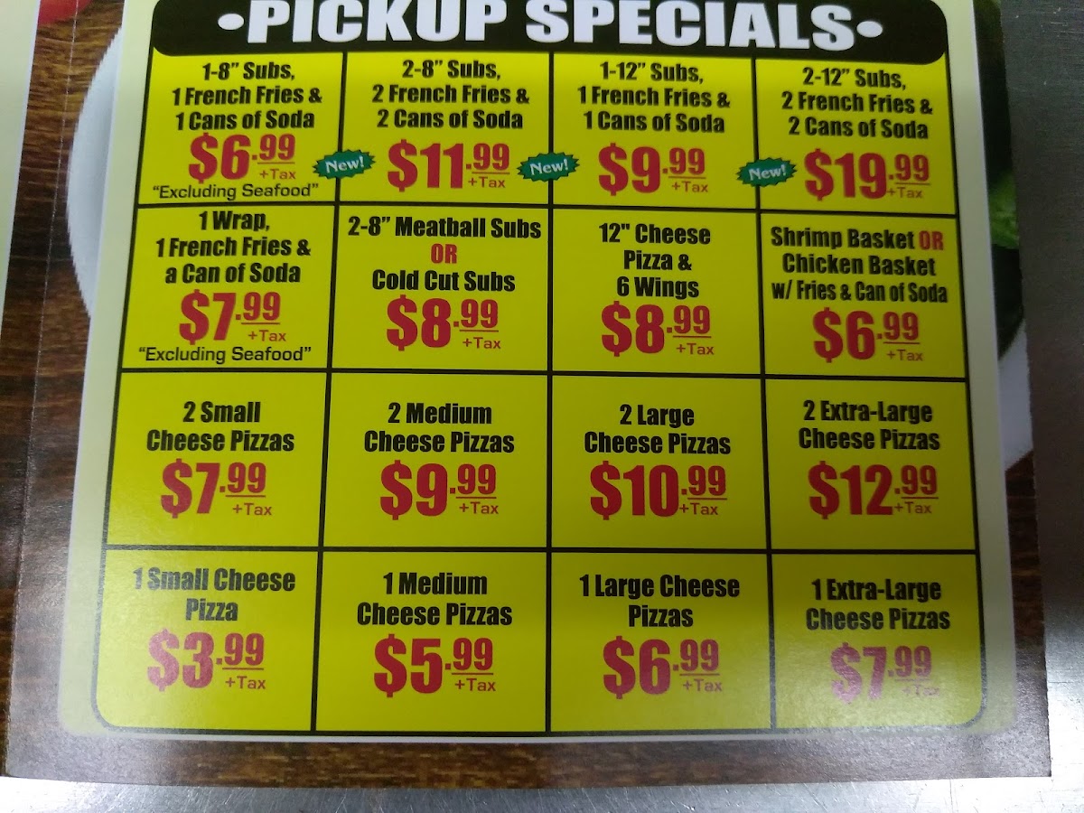 2- 8" Subs, 1 Med 1- Topping Pizza , 2 Fries & 2 Cans Of Soda